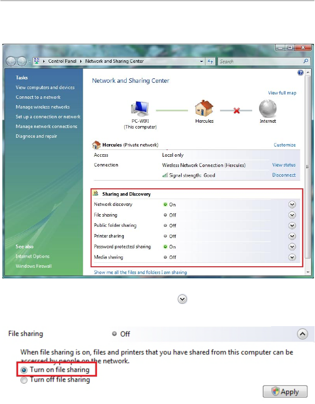- In the Sharing and Discovery zone, click the Off link or the button located opposite File sharing.